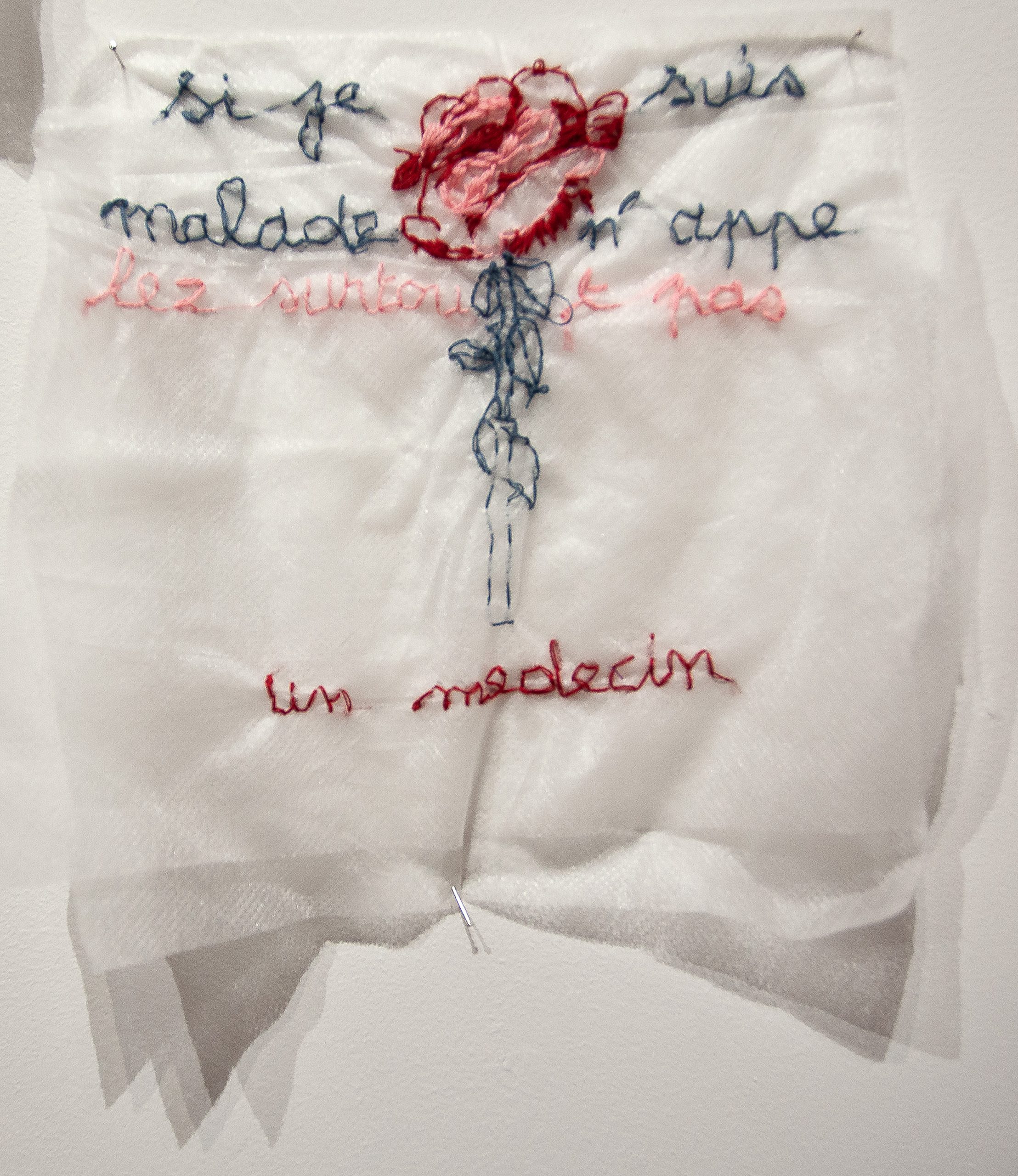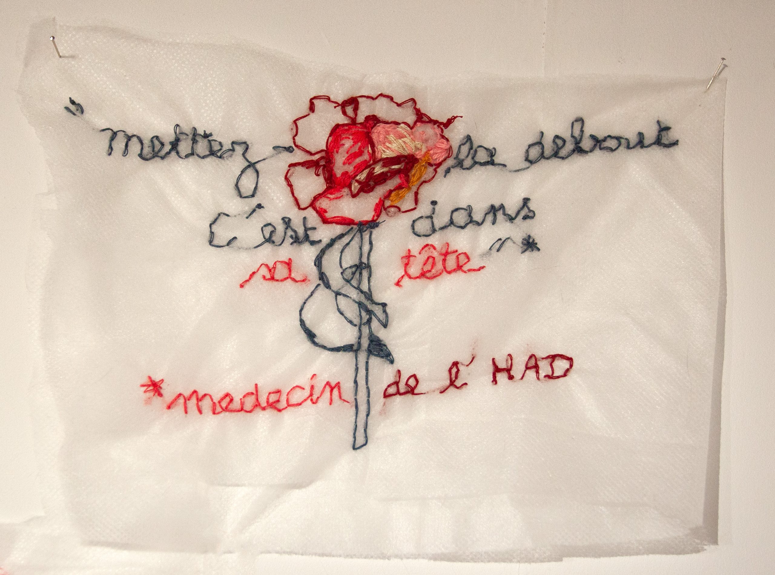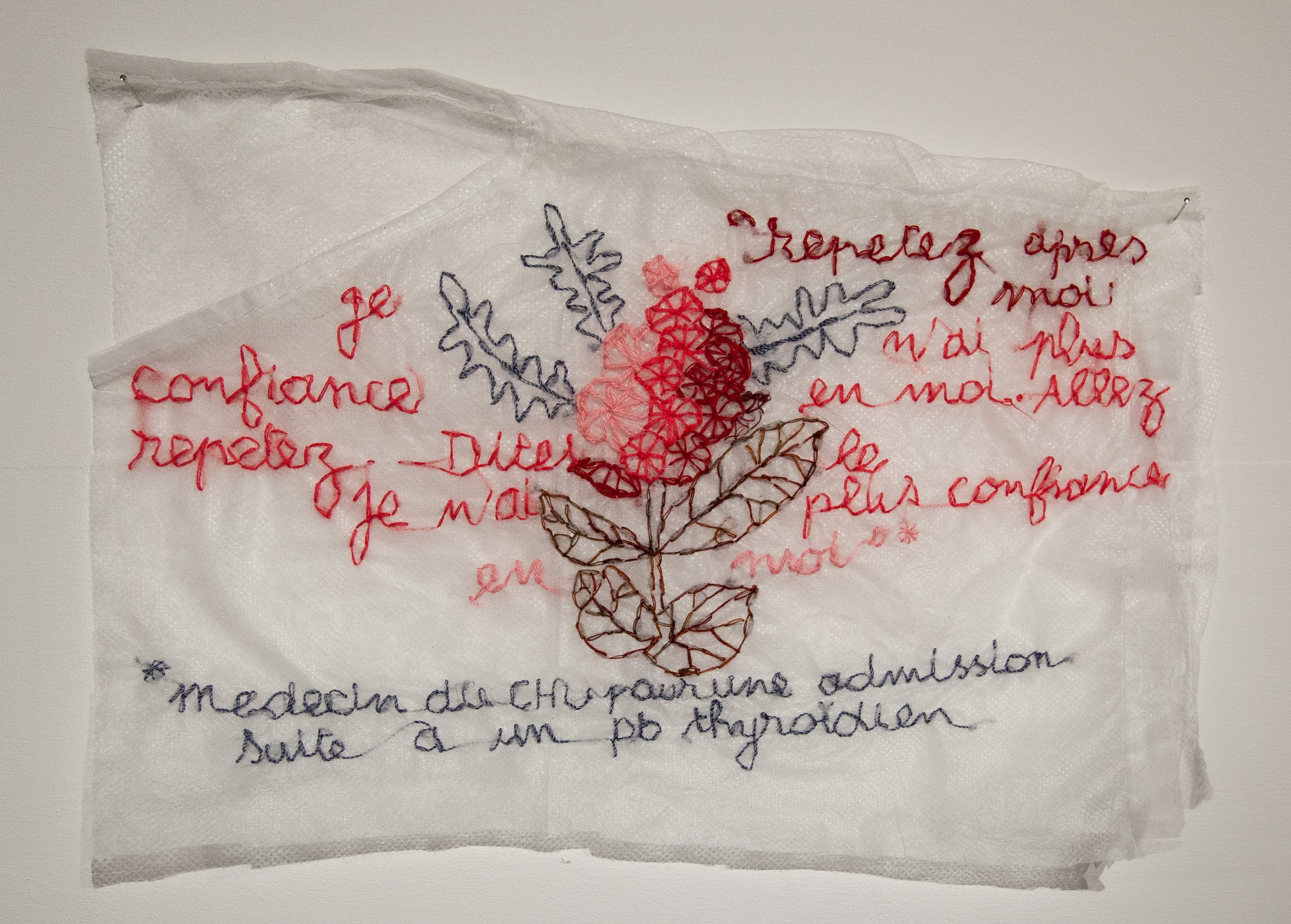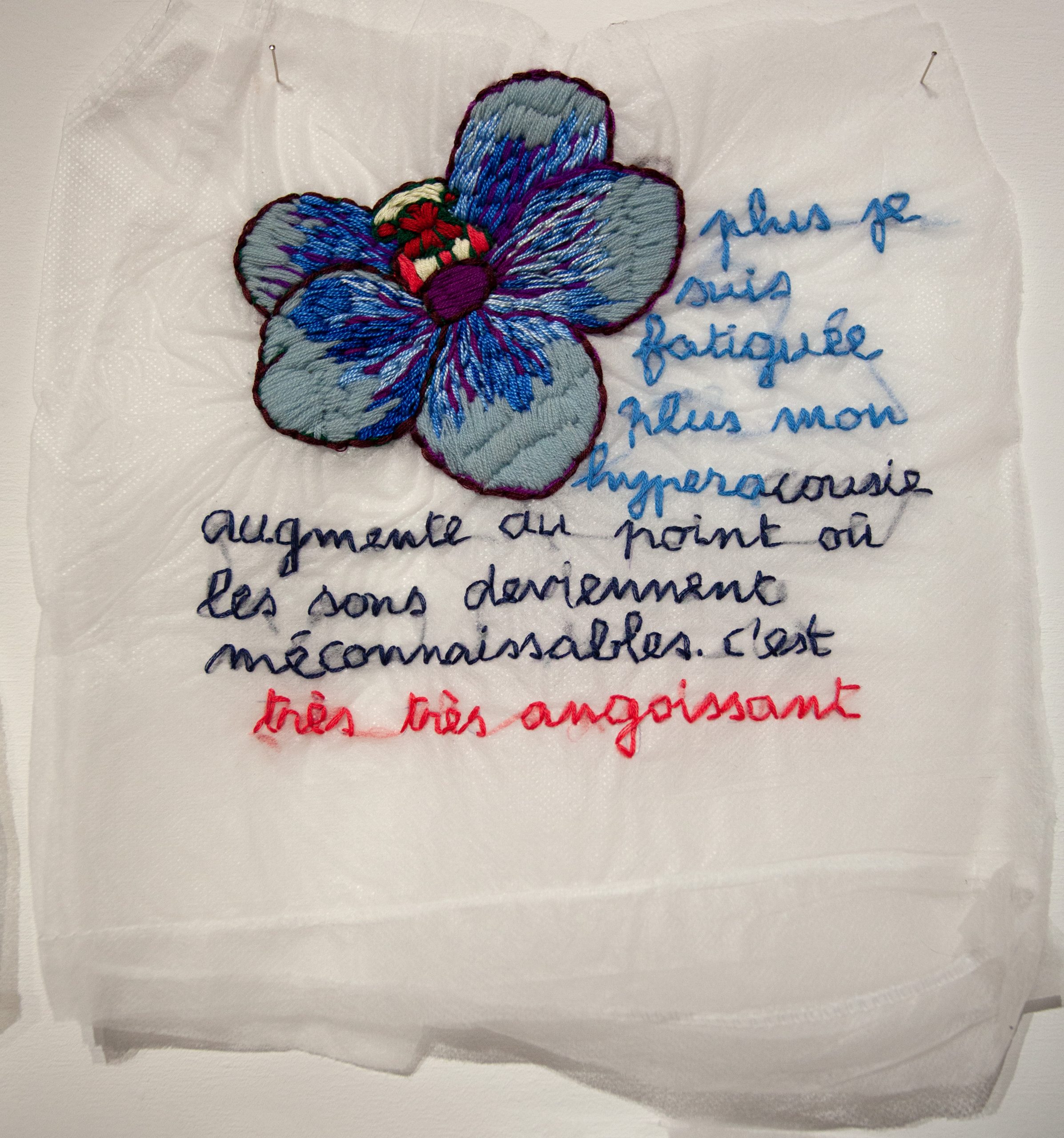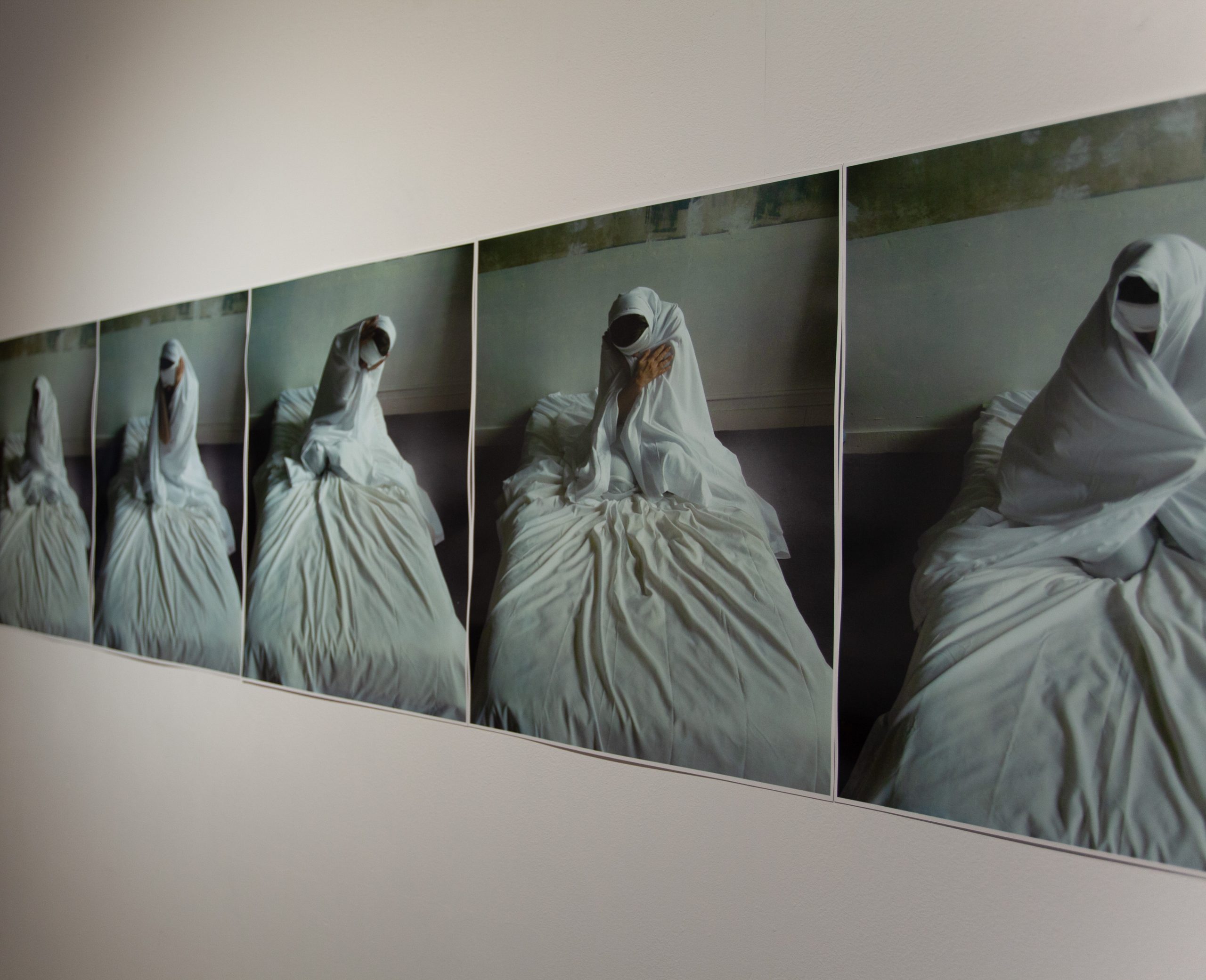 Dans cette exposition elle a imaginé d’évoquer la poétique du « vêtement maladif, revendicatif et chorégraphique » dans l’espace du lit.