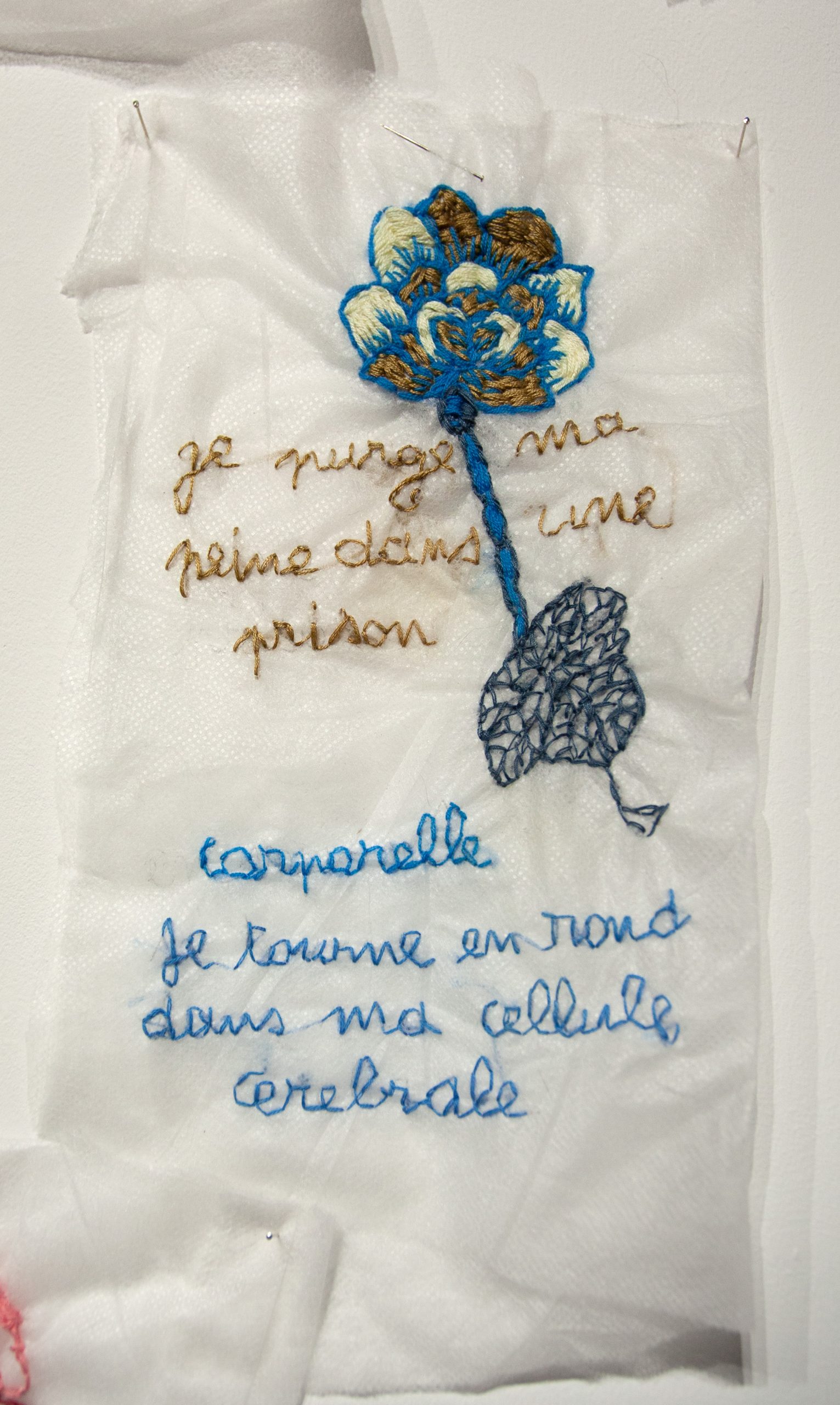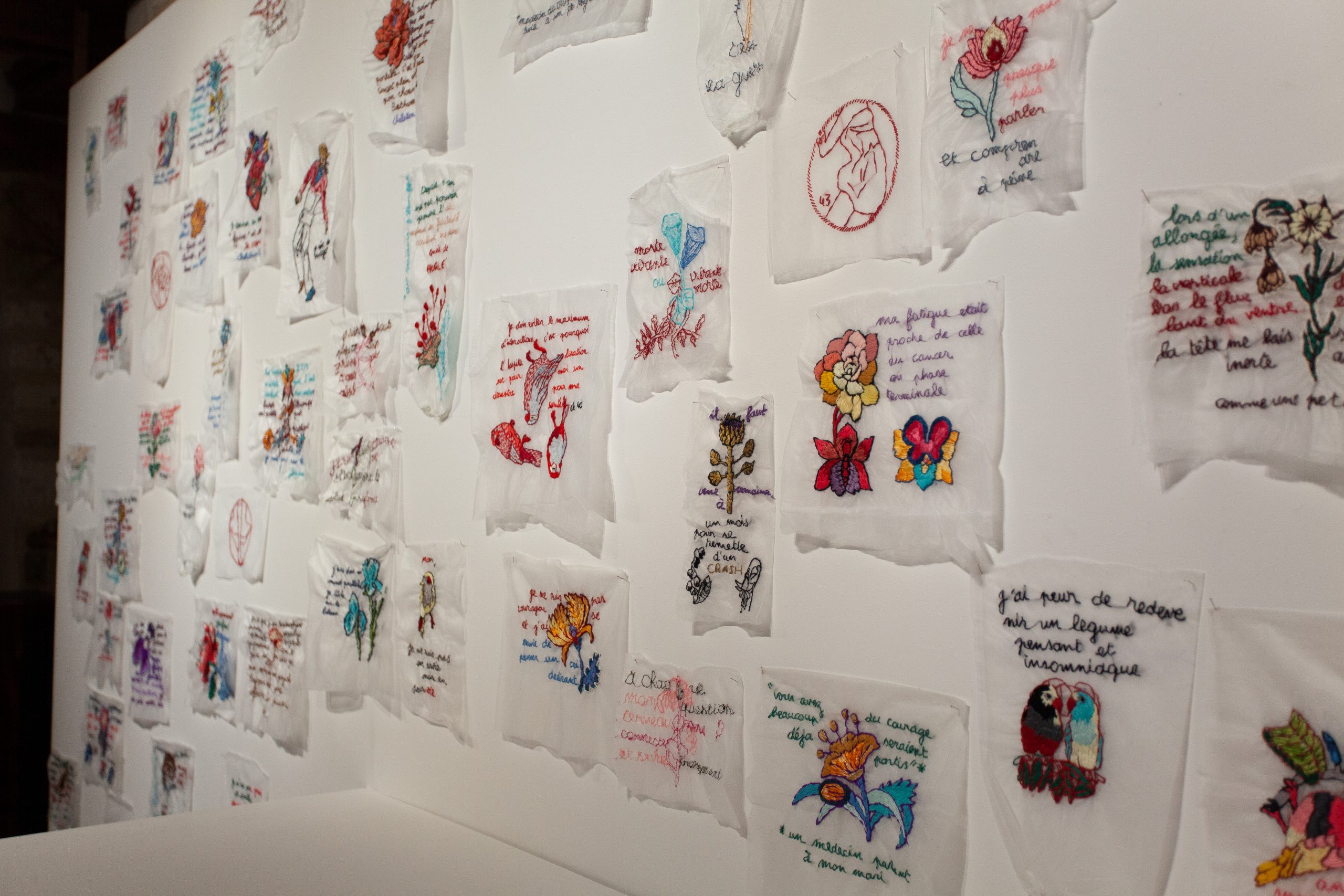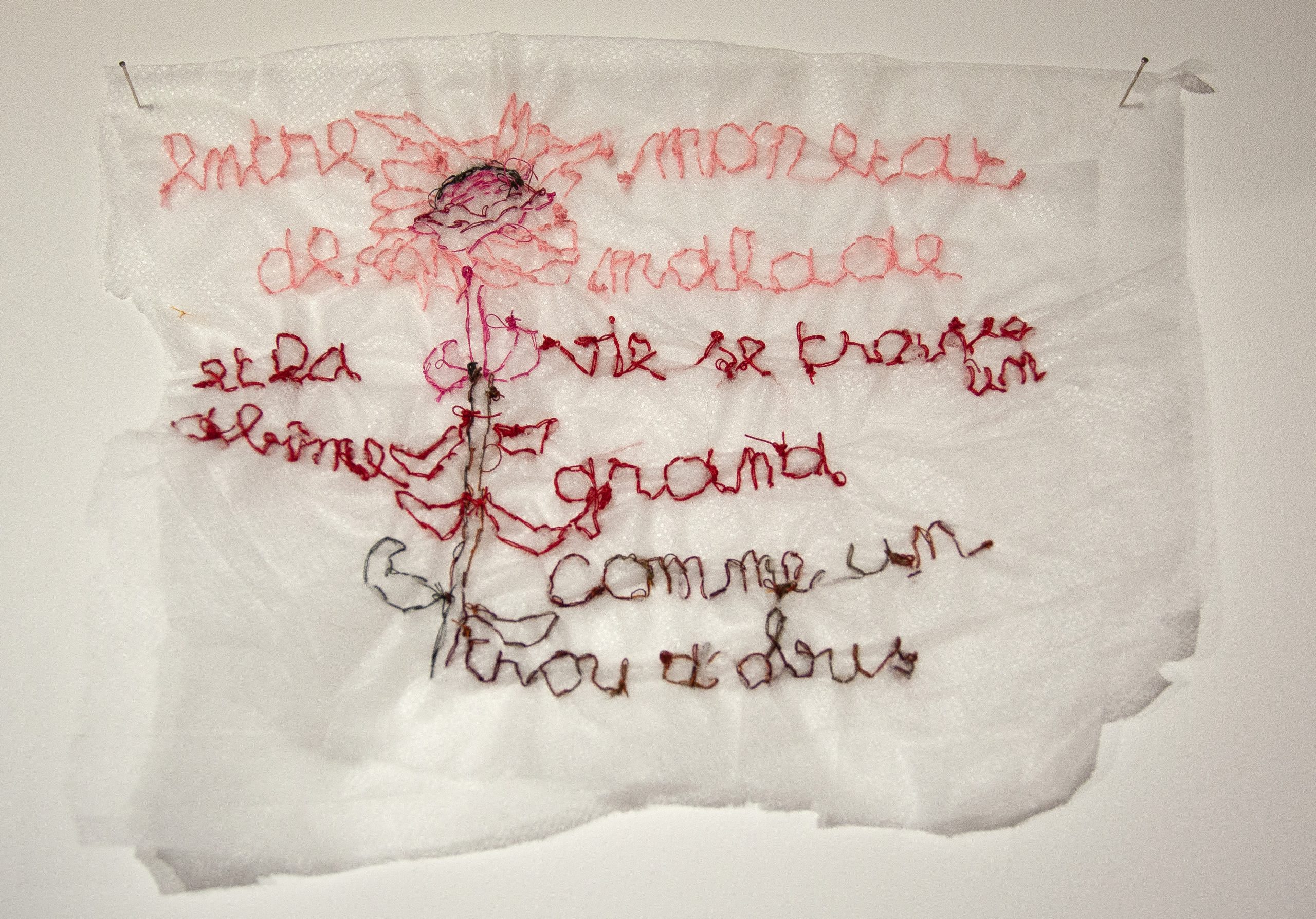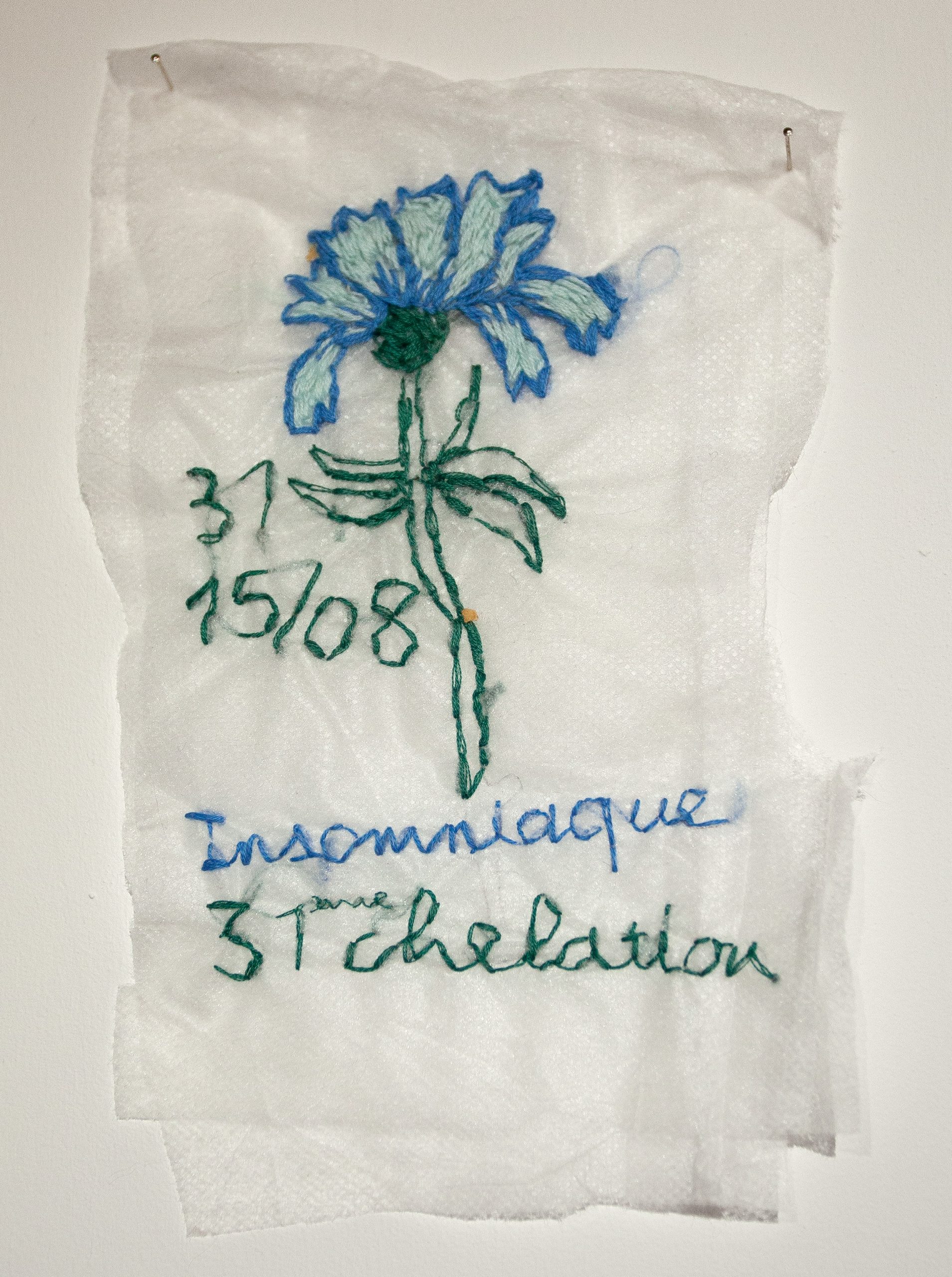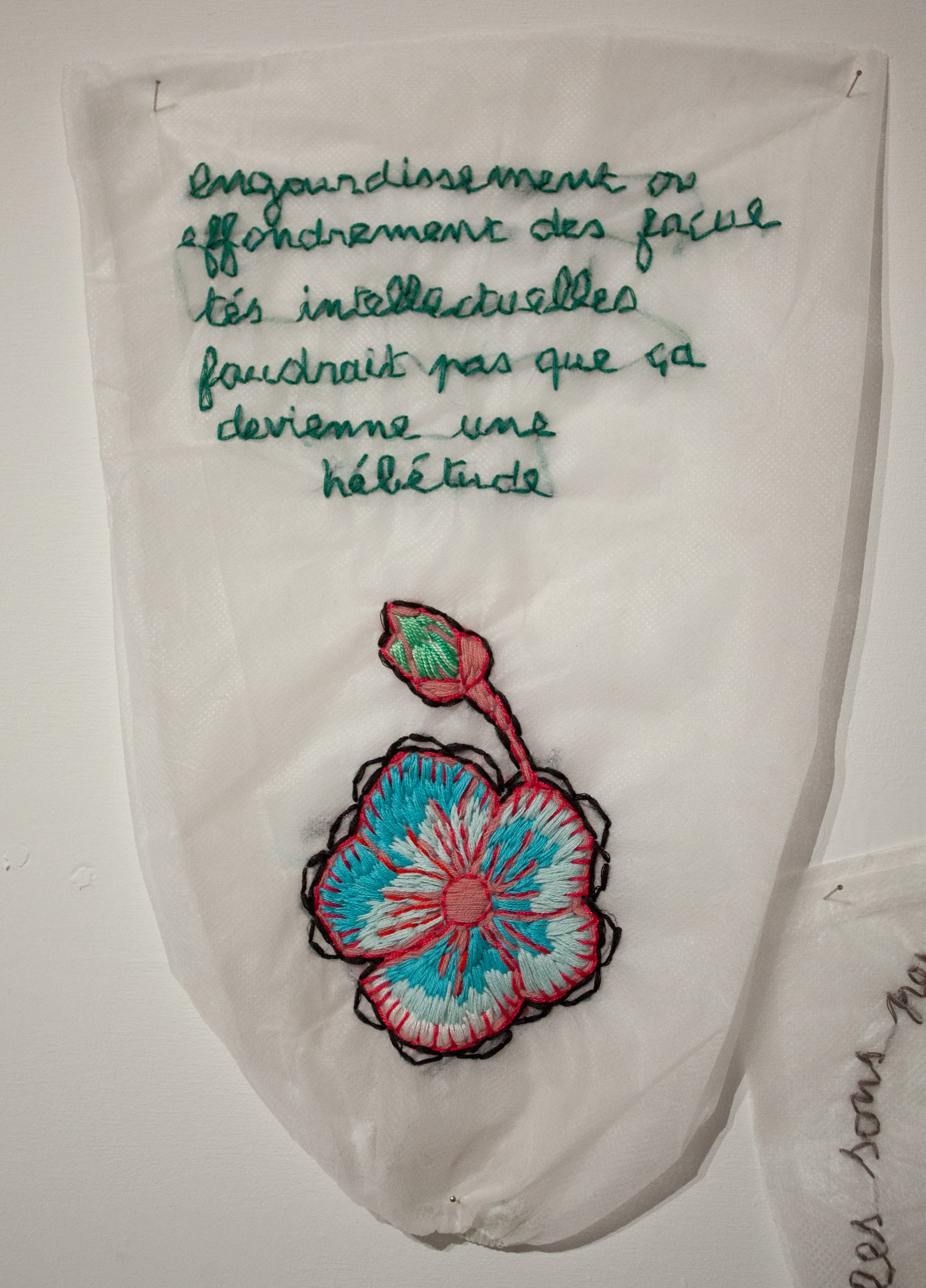 Dans cette exposition elle a imaginé d’évoquer la poétique du « vêtement maladif, revendicatif et chorégraphique » dans l’espace du lit.
